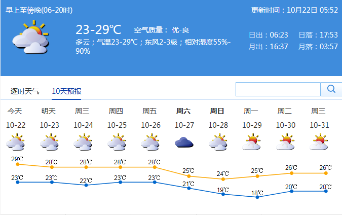 深圳新聞網(wǎng)訊 進入10月中旬,西太平洋上的臺風(fēng)們終于“安靜”下來,冷空氣逐漸成為接下來的主角,我國北方城市也紛紛步入秋季。盡管全市在10月11日早晨全市最低氣溫普遍在20℃左右,但距真正入秋還有一定距離。據(jù)市氣象局預(yù)測,22日至26日我市大致多云,間中有小雨,最低氣溫22-24℃,最高氣溫27-29℃。