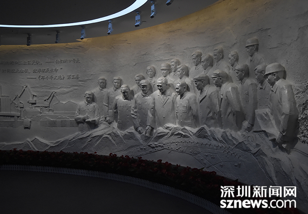 浮雕還原了1984年鄧小平第一次南巡期間,鄧小平、楊尚昆、王震等中央領導聽取袁庚介紹蛇口工業(yè)區(qū)發(fā)展情況的歷史一刻。