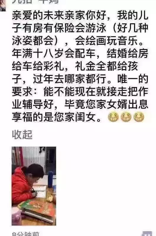 這兩天刷爆朋友圈的一種特殊的文體在朋友圈火了起來,這些文章都是寫給未來的親家的,文章開頭先是對自家娃大力夸獎一番,什么有房有車、會游泳、婚禮豪配等要素,一個都不落下;文章的最后提出唯一的要求,那就是把娃現(xiàn)在就接走。這些文章充分顯示了家長在輔導(dǎo)自己孩子做作業(yè)的時候,心情不太舒暢。