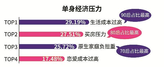 脫單難點中的經(jīng)濟壓力層面分析發(fā)現(xiàn),生活成本過高是影響脫單的最大單身壓力,其次是買房壓力,原生家庭負擔(dān)重以及戀愛成本過高。