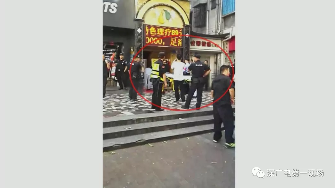 位于白石洲江南百貨旁的事發(fā)地,一名年輕男子正躺在地上手捂著腹部,一旁還有兩名女性同伴在照顧。