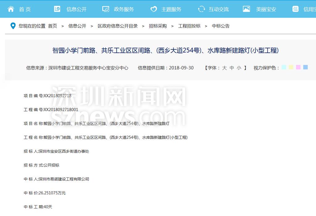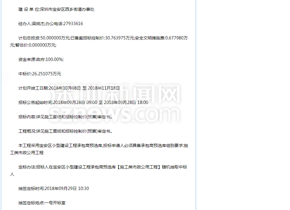針對(duì)網(wǎng)友反映的情況,記者查閱相關(guān)資料發(fā)現(xiàn),寶安智園小學(xué)門(mén)前的施工工程于2018年9月28日公開(kāi)招標(biāo)。