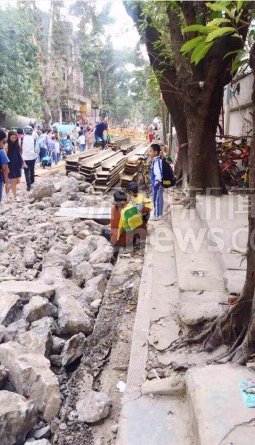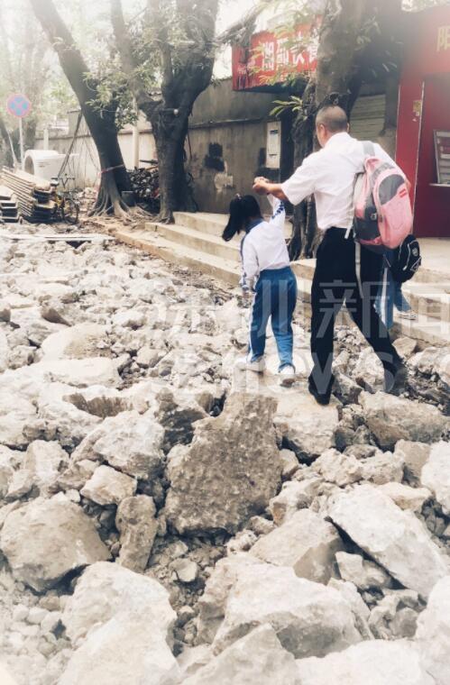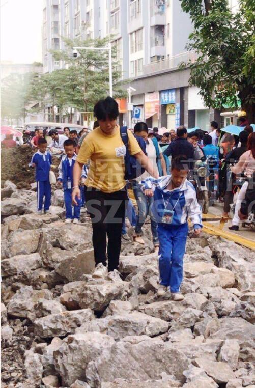 寶安智園小學外多個路口同時施工,學生每天踩著石頭路上下學