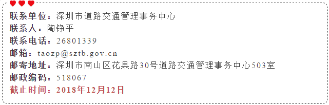 根據(jù)《深圳市機(jī)動(dòng)車道路臨時(shí)停放管理辦法》相關(guān)規(guī)定,市交委現(xiàn)就以上18條道路路邊停車泊位設(shè)置方案公開(kāi)征求意見(jiàn)。市民如有意見(jiàn)和建議,可于2018年12月12日前反饋給市交委。郵寄地址為深圳市南山區(qū)花果路30號(hào)道路交通管理事務(wù)中心503室。