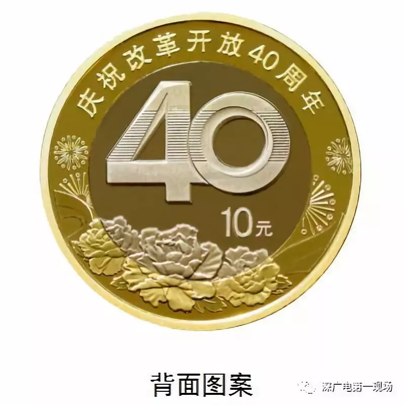 雙色銅合金紀(jì)念幣背面主景圖案為阿拉伯?dāng)?shù)字“40”,背景圖案為牡丹花、飄帶和禮花。主景圖案上方刊“慶祝改革開放40周年”字樣,右下方刊面額“10元”字樣。