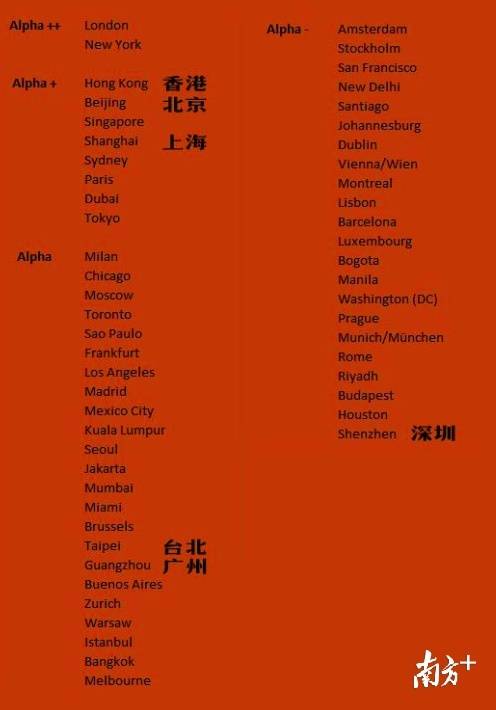 其它的中國城市,香港、北京、上海位于第二檔Alpha+級,分別位于全球3、4、6位,該級共有8個(gè)城市;臺(tái)北、廣州位于第三檔Alpha級,分別位于全球26、27位,該級共有23個(gè)城市。