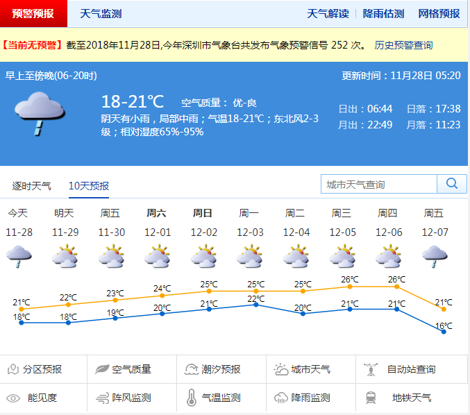 深圳市氣象局預(yù)計(jì),29日零星小雨轉(zhuǎn)多云,可見(jiàn)陽(yáng)光;30日到12月1日陰天間多云,偶有零星小雨;2到3日,多云,可見(jiàn)陽(yáng)光。