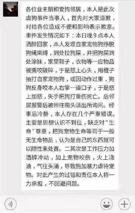 當天深夜,男子在業(yè)主群中道歉,稱自己晚上9點醉酒回家,發(fā)現(xiàn)自家寵物狗掙脫狗鏈,到處拉屎還將家里的鞋子、衣物撕咬破碎,抽打自家寵物狗時,又被反咬一口,才會失手將狗打成重傷,同時男子表示“對此產(chǎn)生的過錯和責任本人將一力承擔,不回避問題?!?/p>