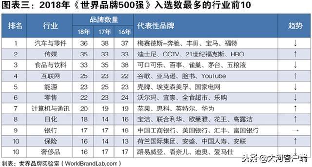 今年《世界品牌500強(qiáng)》共覆蓋了57個(gè)行業(yè)。其中,汽車與零件行業(yè)共有36個(gè)品牌入榜,排名繼續(xù)保持第一;傳媒行業(yè)今年上榜了35個(gè)品牌,位居行業(yè)第二;食品與飲料行業(yè)繼續(xù)下滑,以33個(gè)品牌退居第三;互聯(lián)網(wǎng)行業(yè)繼續(xù)保持上漲的勢(shì)頭,以25個(gè)品牌超過能源行業(yè)(23個(gè))排名第四。零售(22個(gè))以及計(jì)算機(jī)與通訊(20個(gè))行業(yè)均有小幅上漲。在過去的一年中,全球互聯(lián)網(wǎng)市場(chǎng)繼續(xù)保持高速增幅,2017年底全球互聯(lián)網(wǎng)用戶接近38億。但是互聯(lián)網(wǎng)行業(yè)的發(fā)展并非一帆風(fēng)順,今年三月,美國(guó)臉書公司陷入數(shù)據(jù)泄漏丑聞,引發(fā)了全互聯(lián)網(wǎng)行業(yè)公司的信任危機(jī),消費(fèi)者開始注意到保護(hù)數(shù)據(jù)隱私的重要性。