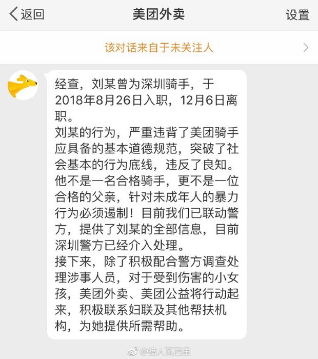 美團確認毆打8歲女童的男子劉某曾是美團騎手,并提供劉某全部信息予警方