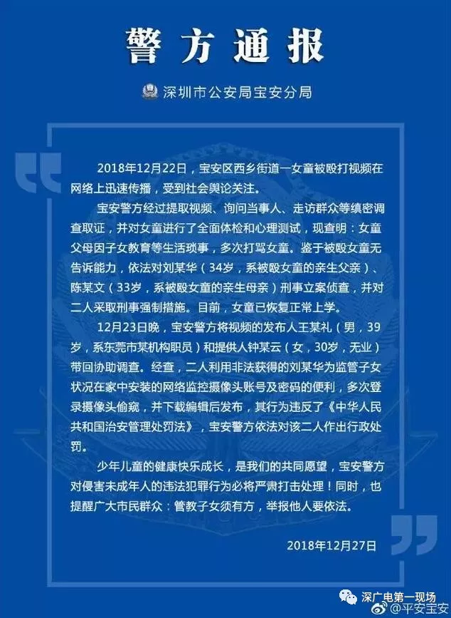 深圳警方通報(bào)“父母虐童”案處理結(jié)果: