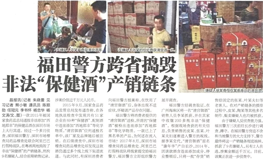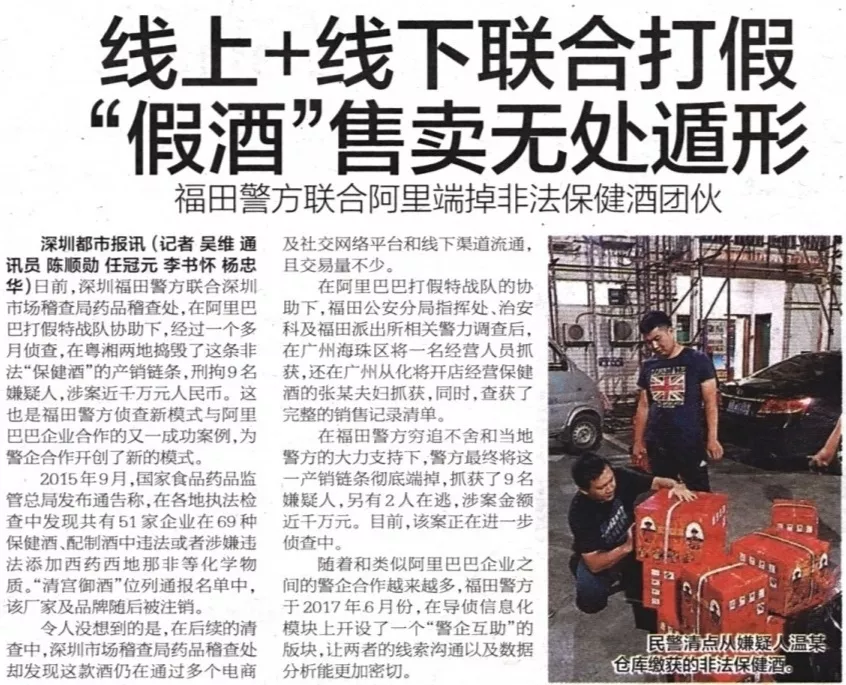 ★★福田警方聯(lián)合深圳市場稽查局藥品稽查處,在阿里巴巴“打假特戰(zhàn)隊”協(xié)助下,經(jīng)過一個多月偵查,于粵湘兩地搗毀了非法“保健酒”的產(chǎn)銷鏈條,刑拘9名嫌疑人,涉案價值近千萬元人民幣。