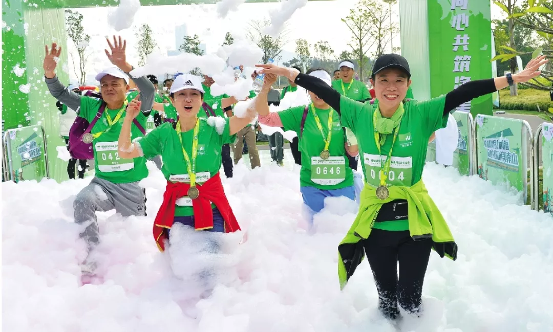 南山街道2018環(huán)鏟灣渠-桂廟渠生態(tài)歡樂跑全長5公里,共設置2個環(huán)保生態(tài)泡泡點、1個團隊任務挑戰(zhàn)游戲點、4個生態(tài)環(huán)保勛章打卡點,并設有南山街道精品特色社區(qū)黨建和生態(tài)環(huán)保建設的知識闖關(guān)答題環(huán)節(jié)。參與者到達終點,完成全部闖關(guān)任務之后可以領取一枚生態(tài)環(huán)保勛章。位于終點主會場的“充氣桌球”、“超級投籃”、“一飛沖天”、“超級扣籃”生態(tài)環(huán)保嘉年華游戲區(qū)域,更是讓全體跑友陷入了歡樂的海洋。起點、中途和終點都設有環(huán)境保護和精品特色社區(qū)創(chuàng)建的宣傳展板,多方位展示南山街道在河渠治理和精品特色社區(qū)建設方面做出的成績。