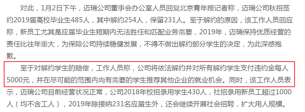 2019年1月2日,邁瑞負責(zé)人回應(yīng):秋招簽約485人中解約254人,會支付違約金