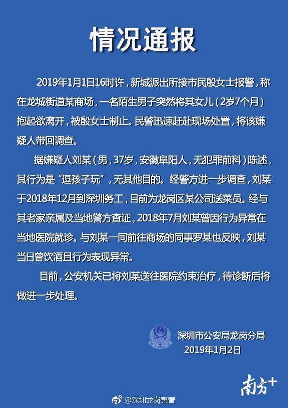 2019年1月2日,深圳市公安局龍崗分局發(fā)布情況通報稱:已將劉某送往醫(yī)院約束治療,待診斷后將做進一步處理。