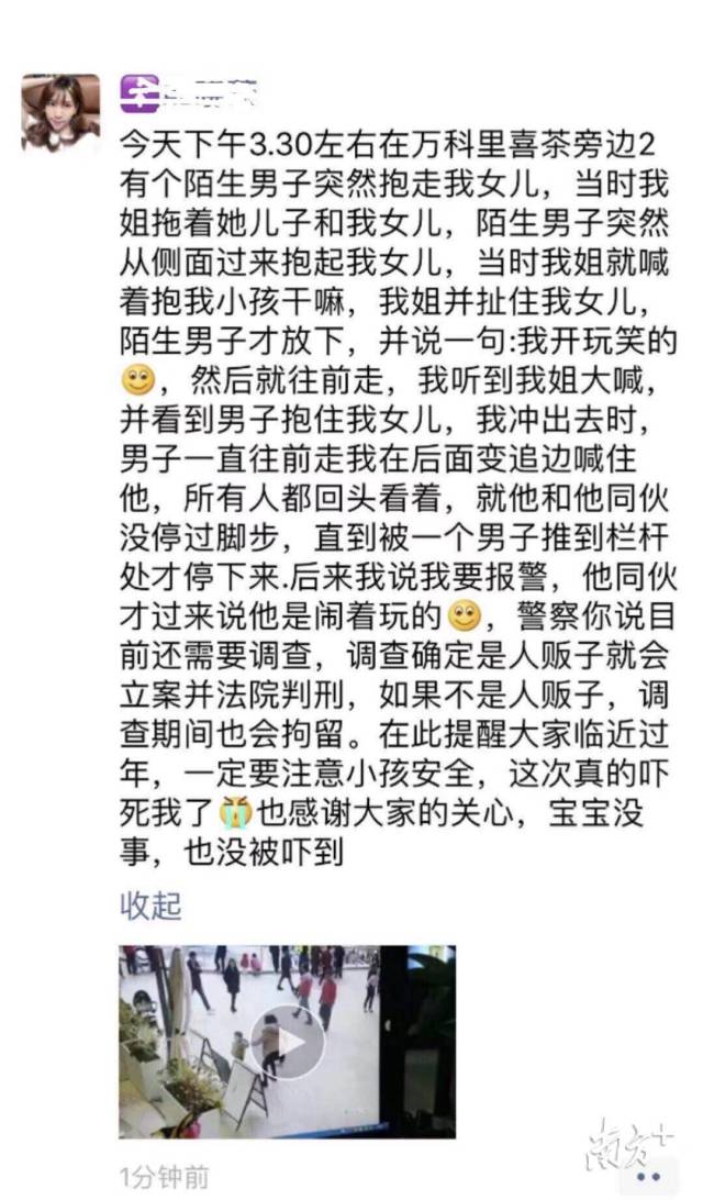 2019年1月1日下午,一位市民發(fā)朋友圈表示:在萬科里逛街時,一名陌生男子突然上前抱走她的女兒,經(jīng)過拉扯制止,該男子才放下孩子。隨后,該女士報警,而男子則表示自己是鬧著玩的。