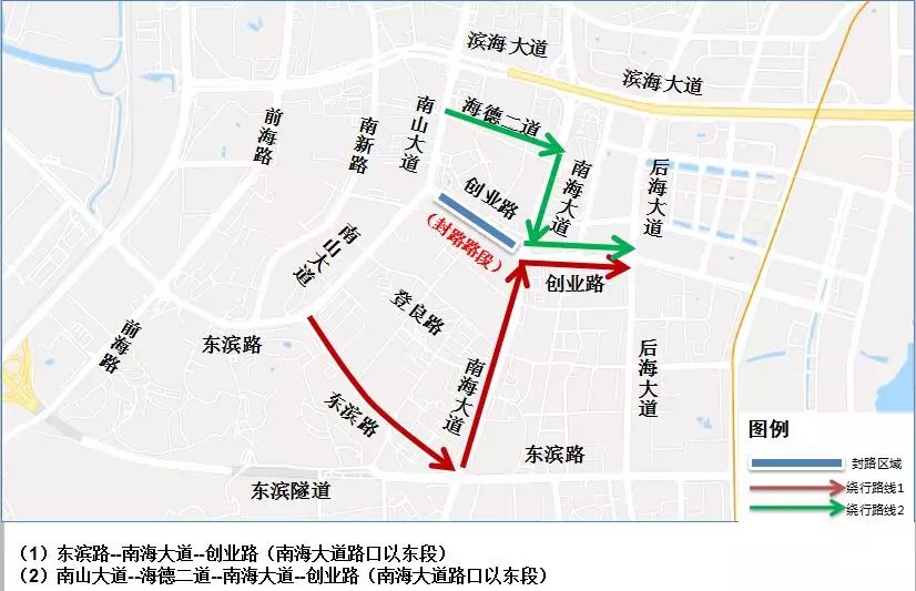 原經(jīng)南山大道轉(zhuǎn)入創(chuàng)業(yè)路東行,前往創(chuàng)業(yè)路(南海大道路口以東段)的,可按以下路線通行: