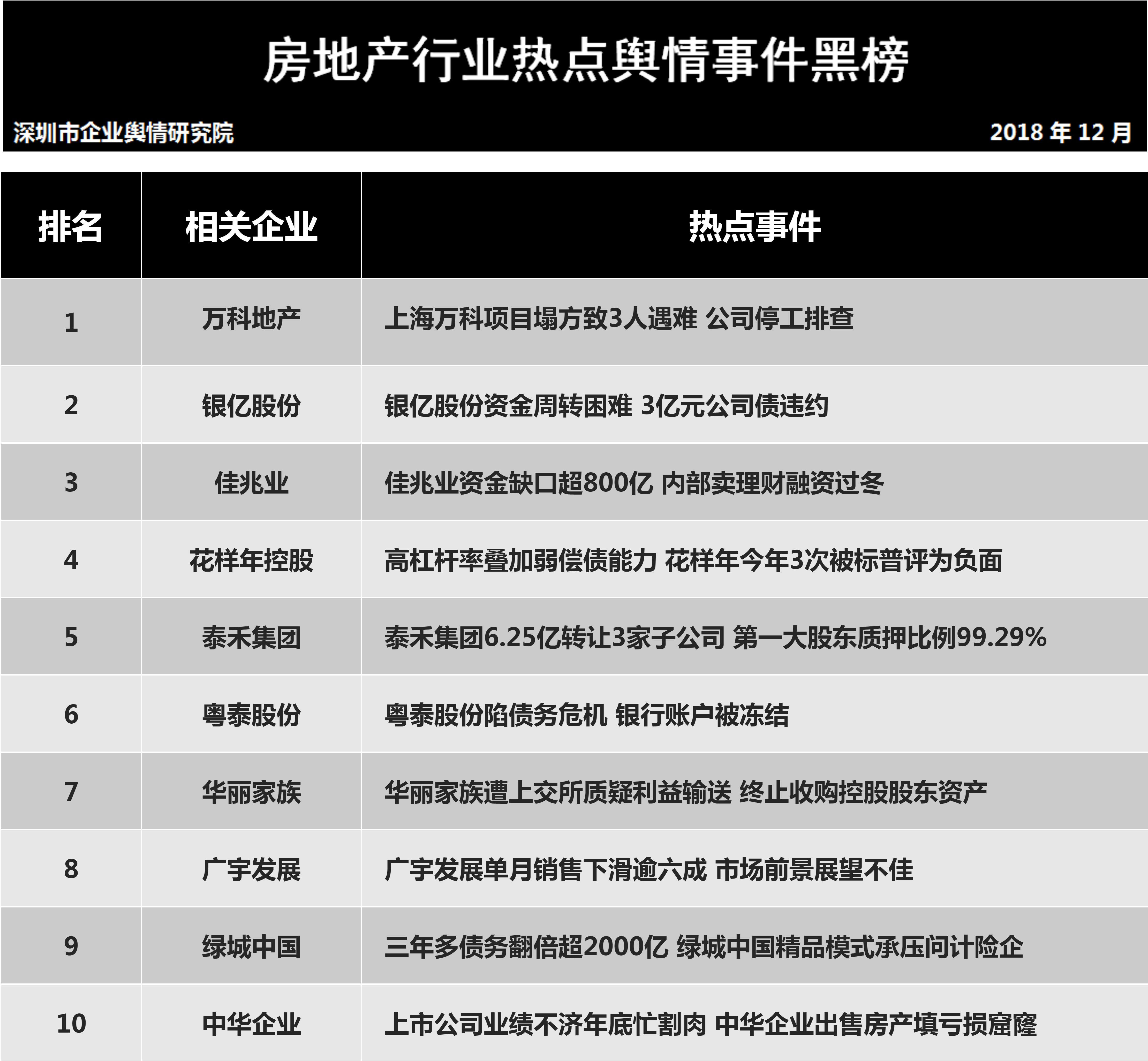 深圳新聞網(wǎng)2019年1月7日訊 (記者田志強(qiáng) 通訊員陳文光)1月7日,深圳企業(yè)輿情研究院發(fā)布第十一批企業(yè)輿情榜單。本次榜單重點(diǎn)聚焦房地產(chǎn)及醫(yī)藥保健兩個行業(yè)。房地產(chǎn)行業(yè)企業(yè)輿情榜單由房地產(chǎn)行業(yè)熱點(diǎn)輿情事件排行榜(紅、黑榜)及房地產(chǎn)企業(yè)公眾形象排行榜組成。