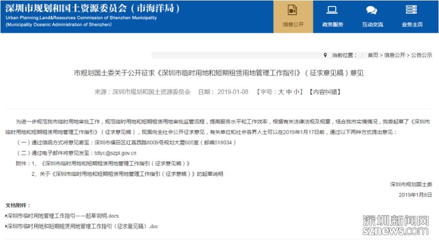 深圳新聞網(wǎng)2019年1月8日訊(記者 潘潤(rùn)華)1月8日,市規(guī)土委起草發(fā)布《深圳市臨時(shí)用地和短期租賃用地管理工作指引(征求意見(jiàn)稿)》(以下簡(jiǎn)稱“征求意見(jiàn)”)。根據(jù)該征求意見(jiàn),社會(huì)投資主體組織實(shí)施的急需公共服務(wù)設(shè)施用地為短期租賃用地,需按照我市地價(jià)測(cè)算相關(guān)規(guī)則繳交租金。