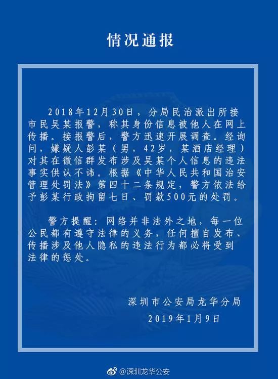 ⑥1月9日,警方發(fā)布通報(bào)。嫌疑人彭某因在微信群發(fā)布涉及吳某(微博 ID:花總丟了金箍棒)的個(gè)人信息,被警方行拘七日,罰款500元。