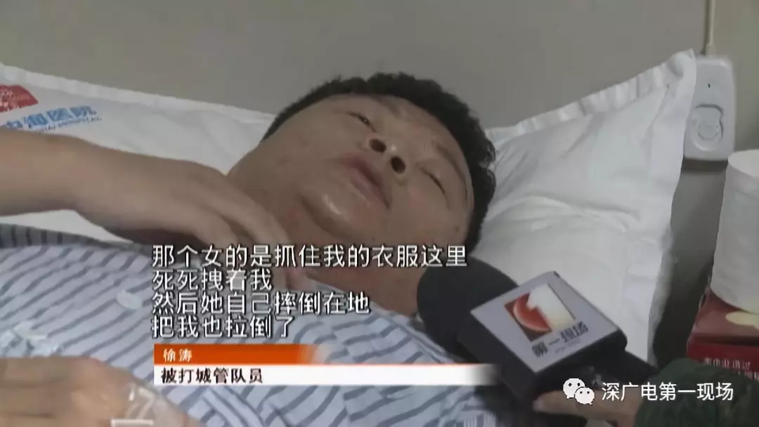 一位在市場所在小區(qū)的居民,在樓上遠(yuǎn)遠(yuǎn)地拍下了事發(fā)的全過程。被踢城管隊(duì)員在倒地前,光頭男子和3名分別身穿粉紅、黃和黑色衣服的女子,對他又扯又打,手腳并用。
