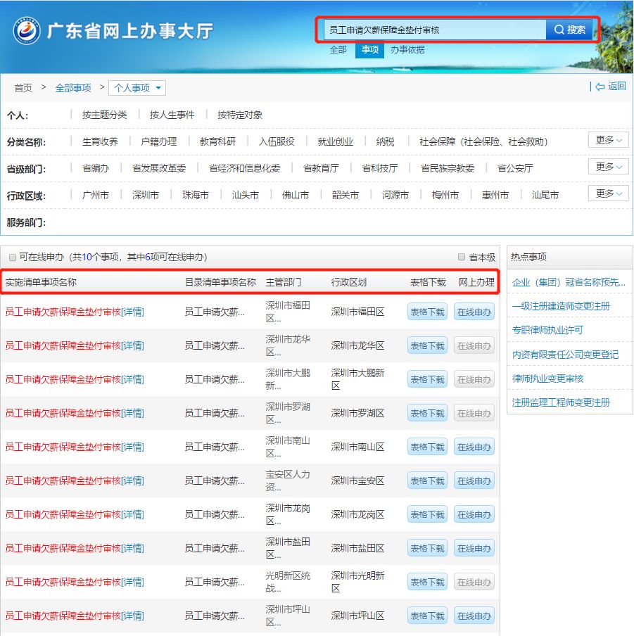 答:員工登錄廣東省網(wǎng)上辦事大廳官網(wǎng),點擊“個人事項”,在搜索欄中輸入“員工申請欠薪保障金墊付審核”,可查詢到各區(qū)“員工申請欠薪保障金墊付審核”事項,選擇所在區(qū)點擊“詳情”,即可查詢到所在區(qū)人力資源部門的咨詢電話、辦理地址、辦理時間和交通指引等相關(guān)信息。