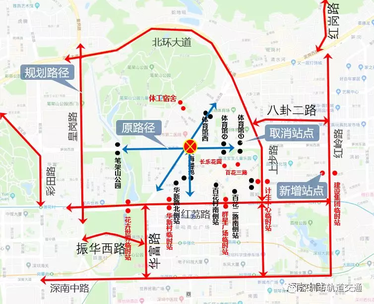 1.臨時取消站點15個:全封閉施工期間,取消體育館、筆架山公園、海馨苑、體育館西、百花一路等5對車站,及華新路北側(cè)站、百花二路南側(cè)站、百花村南側(cè)站等,共計15個站點(含分站),增設(shè)14個臨時??奎c(花卉世界臨時站、華新村臨時站、群星廣場臨時站、計生中心臨時站、建設(shè)集團臨時站、體工宿舍、華富北屋村、長樂花園、百花三路)。(詳見圖3)