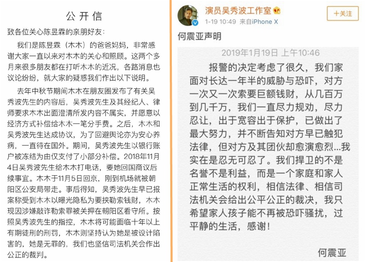 深圳新聞網(wǎng)1月22日訊(記者 張玲)近日,演員吳秀波婚內(nèi)出軌事件再度發(fā)酵在微博引發(fā)熱搜,而這次事件的主角則是之前銷聲匿跡已久的陳昱霖(藝名)。2019年1月18日,陳昱霖父母微博公開發(fā)表聲明稱女兒被吳秀波欺騙回國(guó)后,吳秀波以“曝光隱私威脅勒索錢財(cái)”為由報(bào)警,女兒在下飛機(jī)后即被警方抓捕。隨后,吳秀波妻子何震亞發(fā)表聲明反擊,稱陳昱霖多次威脅索要巨額財(cái)務(wù),數(shù)額一度高達(dá)千萬(wàn),在忍無(wú)可忍的情況下才選擇報(bào)警,希望通過(guò)司法途徑維護(hù)自己的權(quán)益。