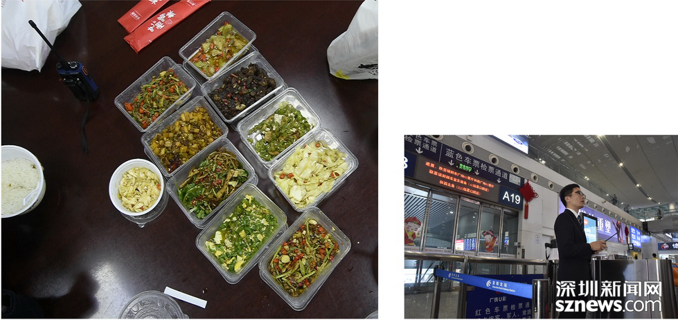 春運(yùn)第一天,人流如織。從下午2點(diǎn)半上班開(kāi)始,聶新強(qiáng)忙了5個(gè)鐘頭,安全送走大約20萬(wàn)人。晚上七點(diǎn)半,在各閘機(jī)口頂替了五位同事吃晚飯之后,聶新強(qiáng)終于吃上了“豪華”外賣(mài)“快餐”,“豪”的是一人獨(dú)享八人份,“快”的是只用了10分鐘不到就結(jié)束了戰(zhàn)斗。