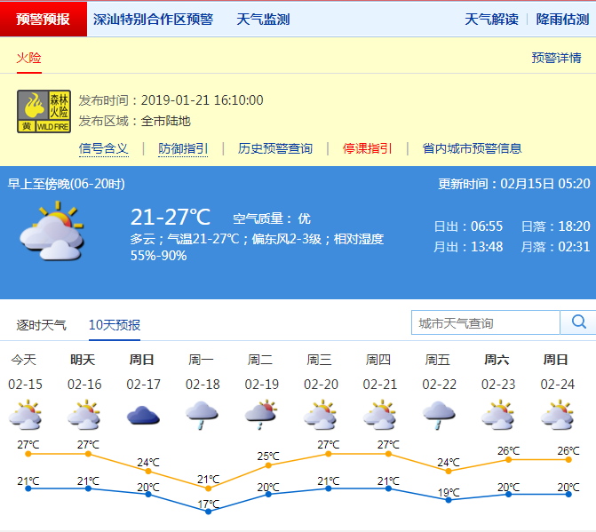 市氣象局預(yù)計(jì),15-16日深圳市可見陽光,溫暖濕潤(rùn)早晚有(輕)霧,氣溫在20-28℃;17-18日天氣轉(zhuǎn)涼,沿海及高地陣風(fēng)可達(dá)8級(jí);18日有小到中雨;19日小雨轉(zhuǎn)多云。請(qǐng)市民注意關(guān)注低能見度和大風(fēng)對(duì)交通和戶外作業(yè)安全的影響。