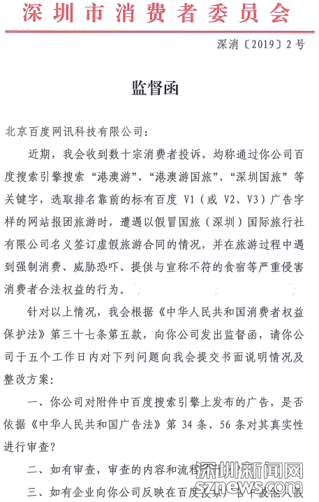 “野馬”旅行社屢禁不絕、愈演愈烈,不僅嚴(yán)重傷害了廣大消費者,傷害了合法企業(yè)的正當(dāng)經(jīng)營,傷害了公平有序的市場競爭秩序,也傷害了深圳的城市形象,這其中,百度難辭其咎。一些不法分子利用百度信譽V認證的核查漏洞和競價排名規(guī)則,把百度作為招徠客源的廣告投放平臺,對消費者起到了極強的誤導(dǎo)作用。在此,深圳市消委會“三問百度”: