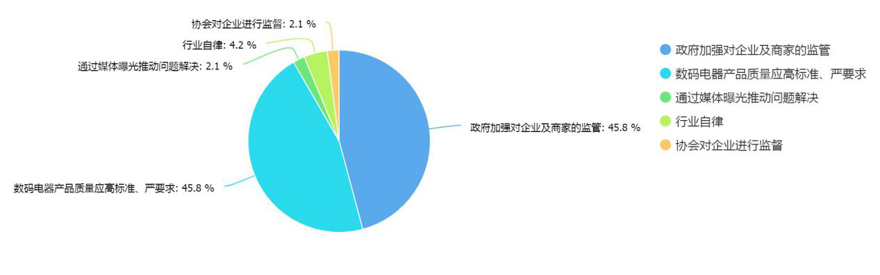 針對目前數碼家電行業(yè)中存在的相關問題,有45.8%的消費者建議通過政府加強對企業(yè)及商家的監(jiān)管,另有部分網民建議數碼家電類產品應該設立更高的的標準,對企業(yè)應該提出更高的要求。