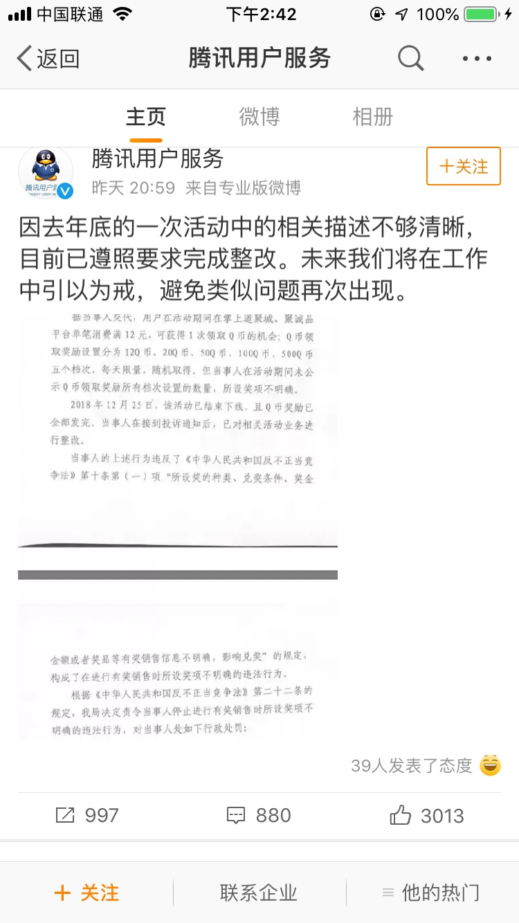 3月20日,微博認證為騰訊公司公關總監(jiān)張軍在微博中解釋:因去年年底的一次活動中的相關描述不夠清晰,目前已遵照要求完成整改。未來我們將在工作中引以為戒,避免類似問題再次出現(xiàn)。