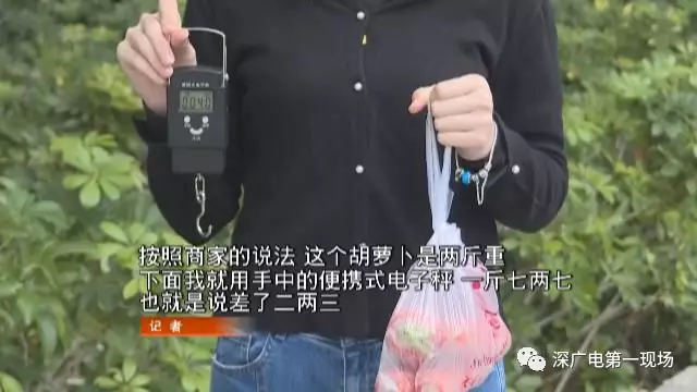 記者按照市民提供的線索,在通道上隨機(jī)選了一個攤位,購買了2斤胡蘿卜,可用自帶的便攜秤稱重后,發(fā)現(xiàn)缺了二兩。而在另外一個攤位上,記者買到的茄子也少了近3兩。