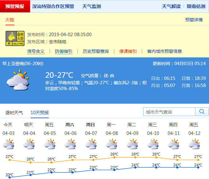 深圳新聞網(wǎng)2019年4月3日訊深圳今日氣溫20-27℃,多云,早晚有輕霧。4月3日至清明假期我市多云為主,降水少,氣溫高,空氣較干燥,沿海和高地間中有6-7級偏東風,氣象條件不利于降低火險風險,森林火險預警信號將持續(xù)到清明假期。