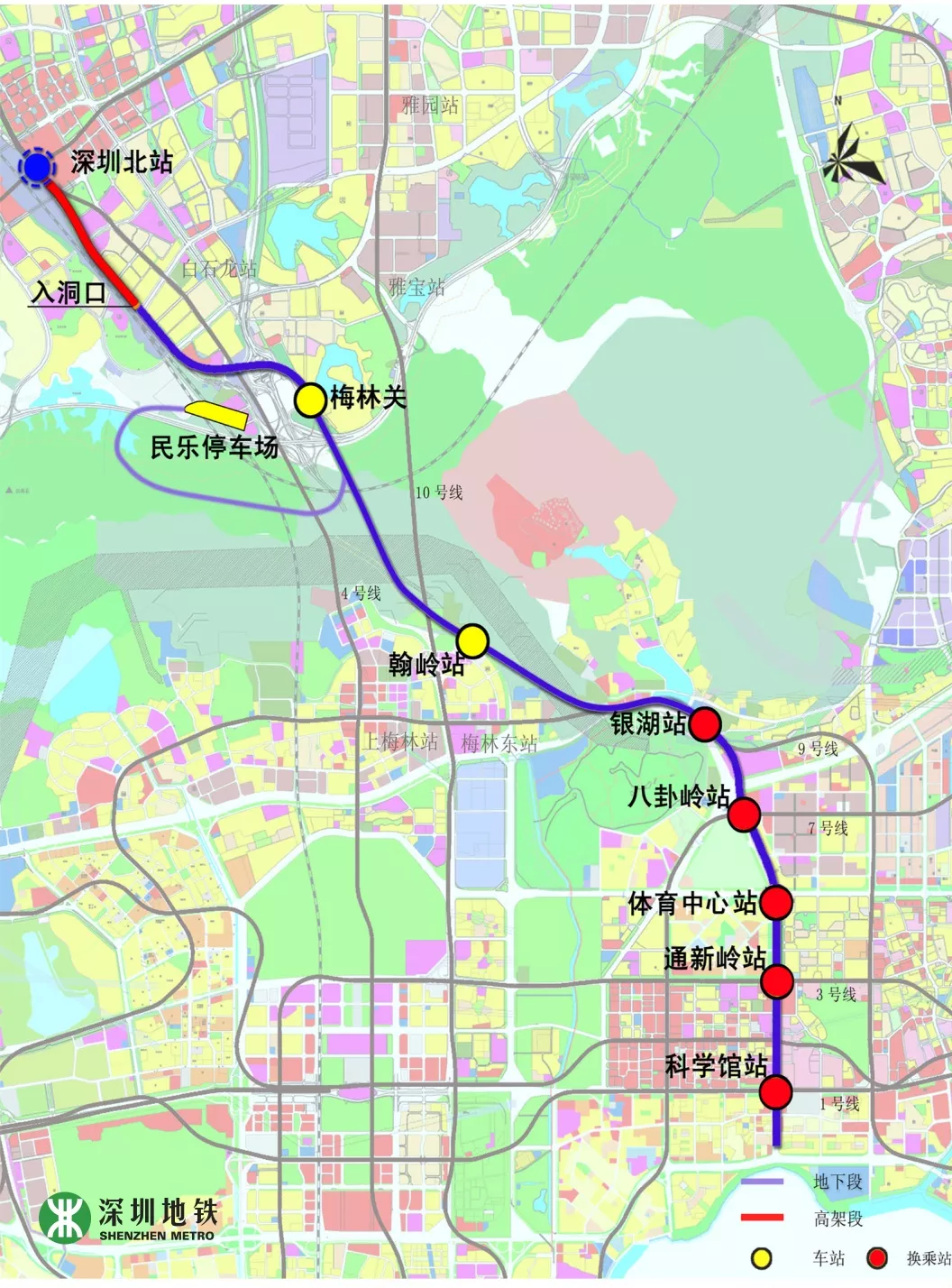 6號線二期工程線路全長約11.8km,換乘車站5座,線路從深圳北站預留高架橋工程引出,途徑龍華、福田、羅湖三區(qū),終止于科學館站。