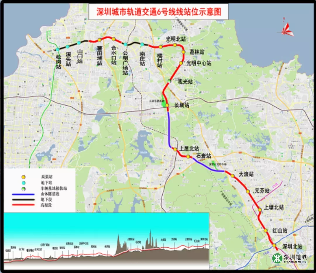 深圳地鐵6號線一期工程全長約49.4km,其中一期工程長約37.6km,起自深圳北站綜合交通樞紐,終止于松崗站,設(shè)車站20座(其中地下站5座,高架站15座),與4、5、11、13、15號線及廣深港客運專線綜合換乘。