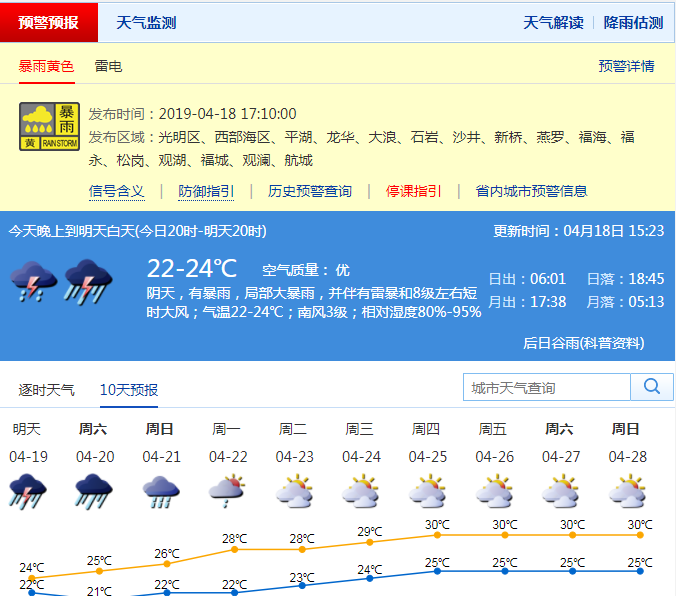 深圳新聞網(wǎng)2019年4月18日訊 今日天氣:陰天間多云,午后轉(zhuǎn)(雷)陣雨,夜間降雨趨于頻密;氣溫22-27℃