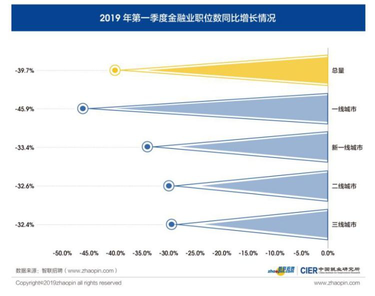 此外,調(diào)研顯示,備受矚目且高薪的金融行業(yè)本季度就業(yè)狀況并未隨著股市的回暖同步好轉(zhuǎn)。根據(jù)智聯(lián)招聘大數(shù)據(jù),金融業(yè)2019年一季度的招聘職位數(shù)降幅在所有行業(yè)中最高,達(dá)39.7%。其中一線城市金融行業(yè)職位數(shù)的降幅最大,為45.9%,新一線、二線和三線城市的降幅均在33%左右。2017年以來(lái),強(qiáng)化監(jiān)管成為金融領(lǐng)域的主基調(diào),在去杠桿、防風(fēng)險(xiǎn)的同時(shí),金融行業(yè)發(fā)展速度有所放緩,向市場(chǎng)提供的就業(yè)機(jī)會(huì)也整體下降,這在互聯(lián)網(wǎng)金融等新興業(yè)態(tài)主要活躍的一線城市表現(xiàn)更為明顯。
