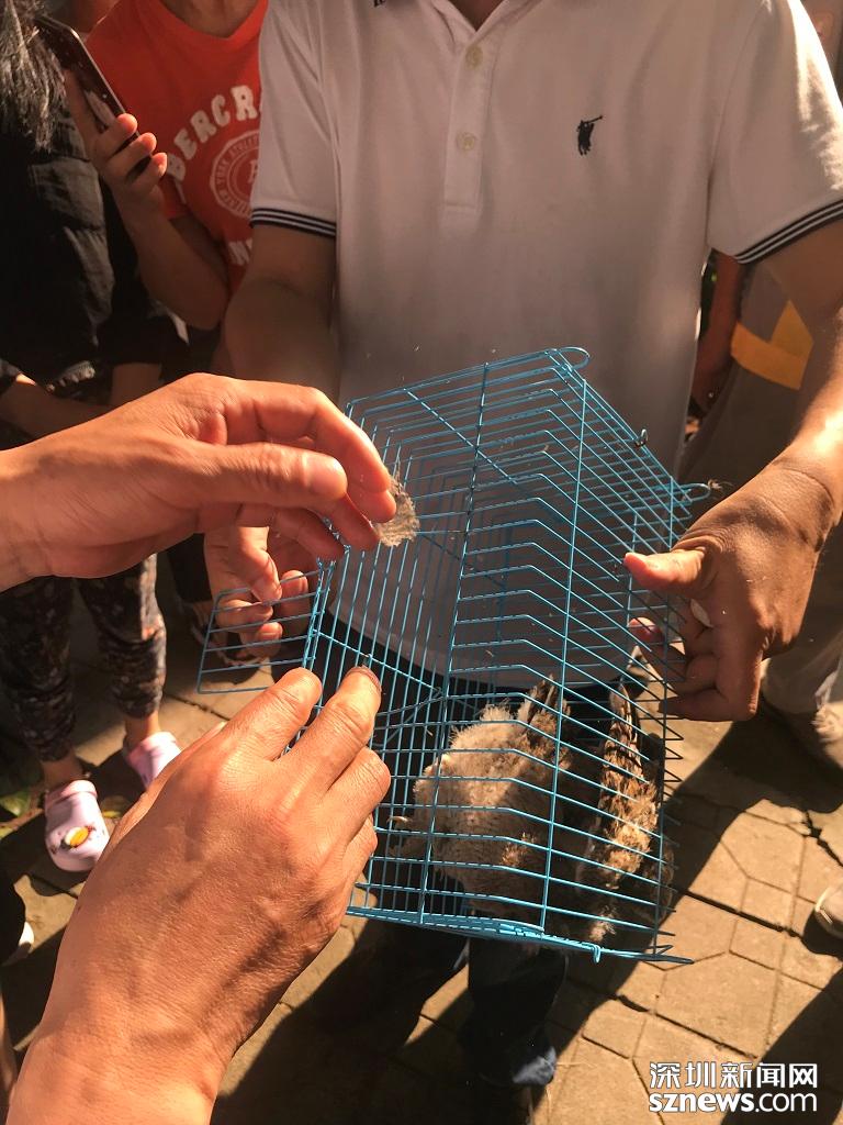 小區(qū)保安先把小貓頭鷹裝進籠子,等待動保所的工作人員到來。深圳新聞網(wǎng)記者 施翔東 攝