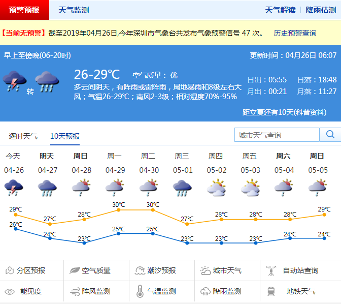 深圳已經(jīng)于2019年4月14日正式入夏,然而深圳夏季平均季長(zhǎng)達(dá)196天,現(xiàn)在都覺得熱了?還差得久呢!不過26-27日將會(huì)進(jìn)入雷雨模式,短時(shí)強(qiáng)降雨的同時(shí)還伴有雷暴和短時(shí)大風(fēng)。本周唯一一天的周六假期要在雨中度過,另外五一假期還有一次強(qiáng)降雨過程。
