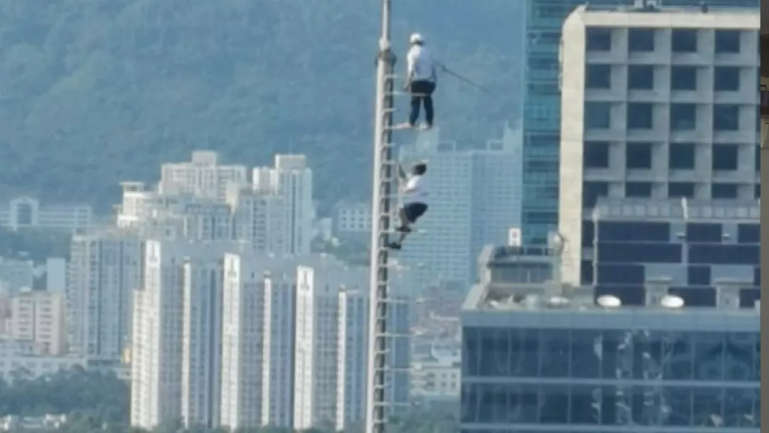 這段視頻拍攝于昨天上午9點(diǎn)左右,視頻拍攝者李先生表示,當(dāng)時(shí)他正在公司值班,往窗外一看,卻發(fā)現(xiàn)對(duì)面的信息樞紐大廈塔頂,靠近中國電信招牌的位置有動(dòng)靜,定睛一看,居然是兩個(gè)人在塔頂?shù)蔫F桿上游走。