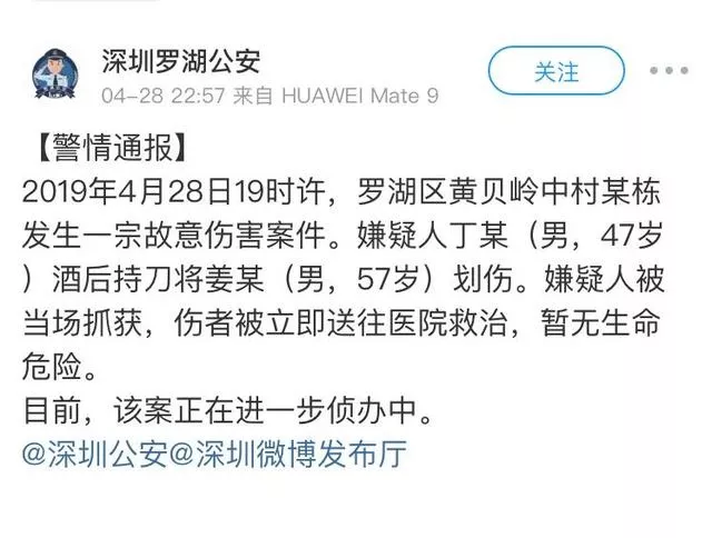 據(jù)記者了解,嫌疑人被當場抓獲,傷者被立即送往醫(yī)院救治暫無生命危險。羅湖公安也發(fā)布了警情通報,行兇者是酒后持刀傷人,警方通報如下: