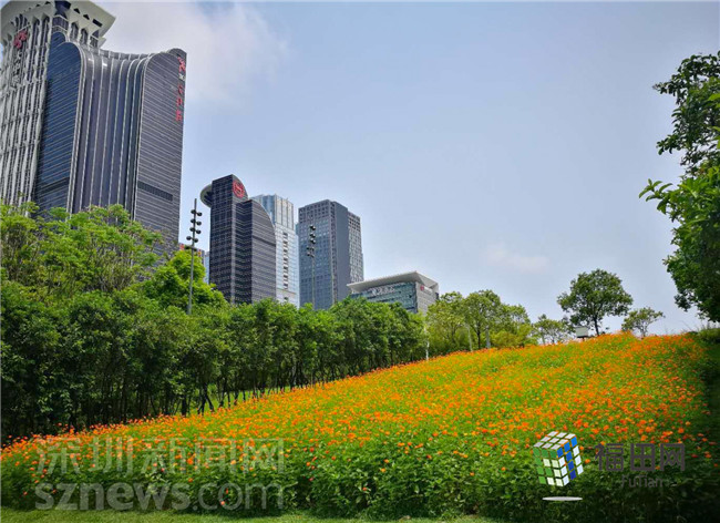 遠(yuǎn)處的平安大廈,近處的綠樹、花海,構(gòu)成了一副靜謐美好的畫面。