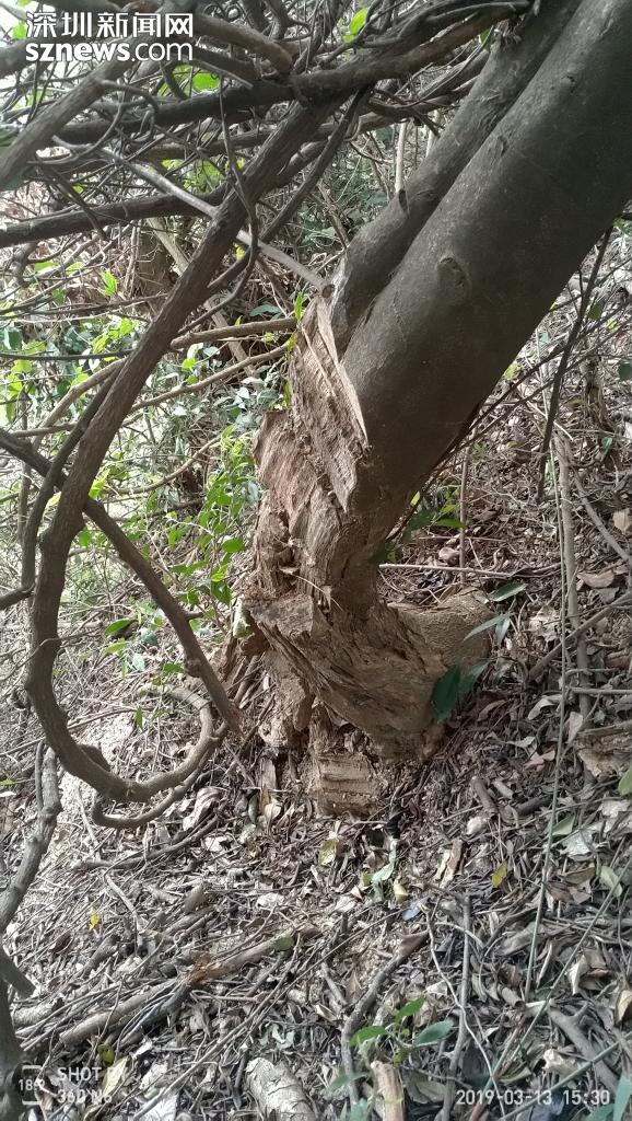 該網(wǎng)友提及的應(yīng)人石村位于深圳石巖,從地圖上看,其“后山”與羊臺(tái)山森林公園連為一體,是附近居民閑暇時(shí)度假踏青的重要選擇。據(jù)了解,網(wǎng)友“詩奴L”于今年3月中旬上山游玩,游玩途中發(fā)現(xiàn)原本茂盛的野生沉香樹大多遭人砍伐?!安环ǚ肿痈F盡一切手段,用鉆、削、劈、鋸等來對(duì)沉香樹進(jìn)行摧殘,這簡直是屠殺式的洗劫!”該網(wǎng)友表示,看到這么多野生沉香樹被殘暴砍伐,真地讓人很氣憤。