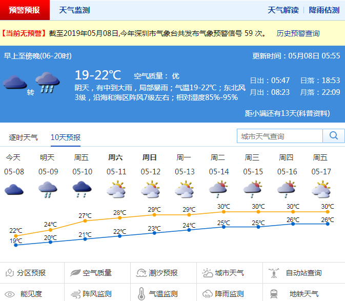 深圳新聞網(wǎng)2019年5月8日訊 6日夜間我市出現(xiàn)局部暴雨,伴有零散雷暴。全市平均雨量33.3毫米,全市最大雨量74.4毫米,出現(xiàn)在南山區(qū)大墈站,我臺先后在全市陸地和海區(qū)發(fā)布了雷電和暴雨黃色預警信號。受降雨影響,早晨最低氣溫19-20℃,白天最高氣溫僅僅22℃左右,不僅“入夏失敗”,不少市民還感覺“入秋”了。未來兩天仍舊體感陰涼。