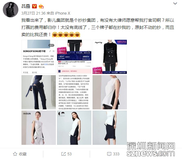 無獨有偶。5月5日,深圳影兒時尚集團(tuán)(以下簡稱:影兒集團(tuán))正式向深圳市中級人民法院提起訴訟請求,就超模呂燕多次在微博上指責(zé)影兒集團(tuán)是“抄抄集團(tuán)”,造成影兒集團(tuán)重大名譽損失和巨額經(jīng)濟損失一事,起訴超模呂燕及其公司上海是你商貿(mào)有限公司不正當(dāng)競爭,要求兩被告立即停止侵權(quán)行為,賠償經(jīng)濟損失1000萬元,并公開道歉。