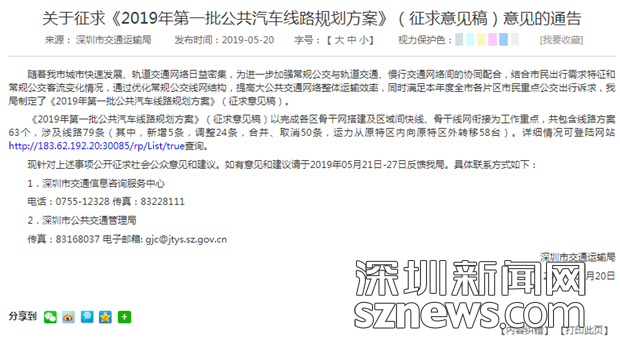 目前,市民可登陸網(wǎng)站http://jtys.sz.gov.cn/查詢詳細情況。同時,深圳市交通運輸局就上述事項公開征求社會公眾意見和建議,如有意見和建議請于2019年05月21日-27日反饋至深圳市交通運輸局。具體聯(lián)系方式如下: