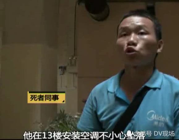 從拍攝的視頻可以看到,死者當(dāng)時(shí)是穿著有"美的公司"公司字樣的衣服,目擊者說,死者是在13樓安裝空調(diào)外機(jī)時(shí)出事的。