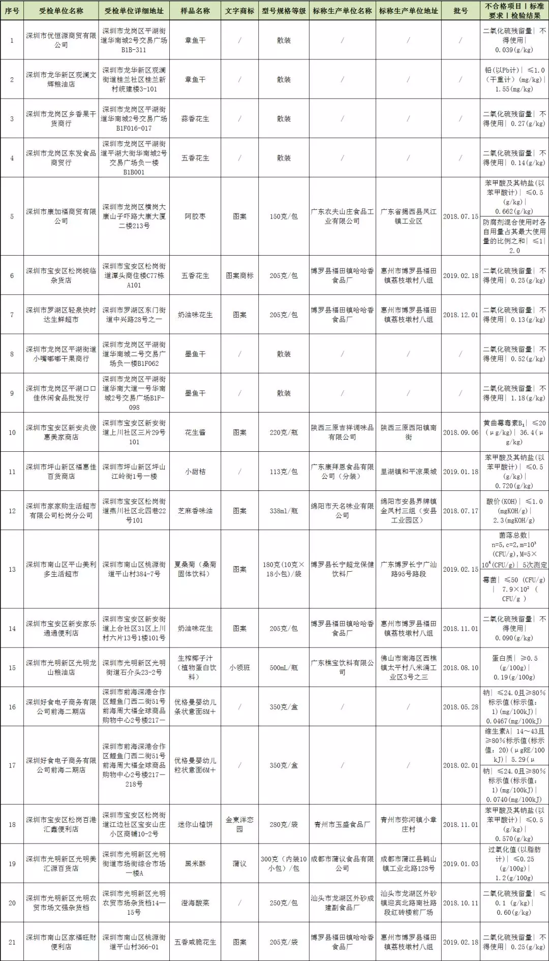 本次共抽檢流通環(huán)節(jié)食品2455批次,涉及流通環(huán)節(jié)經(jīng)營(yíng)主體870家次,共檢測(cè)食品指標(biāo)14705項(xiàng)次。其中檢出不合格樣品21批次,涉及不合格食品類別有炒貨食品及堅(jiān)果制品6批次,食用油、油脂及其制品1批次,蔬菜制品1批次,薯類和膨化食品1批次,水產(chǎn)制品4批次,水果制品3批次,特殊膳食食品2批次,調(diào)味品1批次,飲料2批次;涉及不合格項(xiàng)目類別為金屬等元素污染、微生物污染、食品添加劑、品質(zhì)指標(biāo)、生物毒素污染。